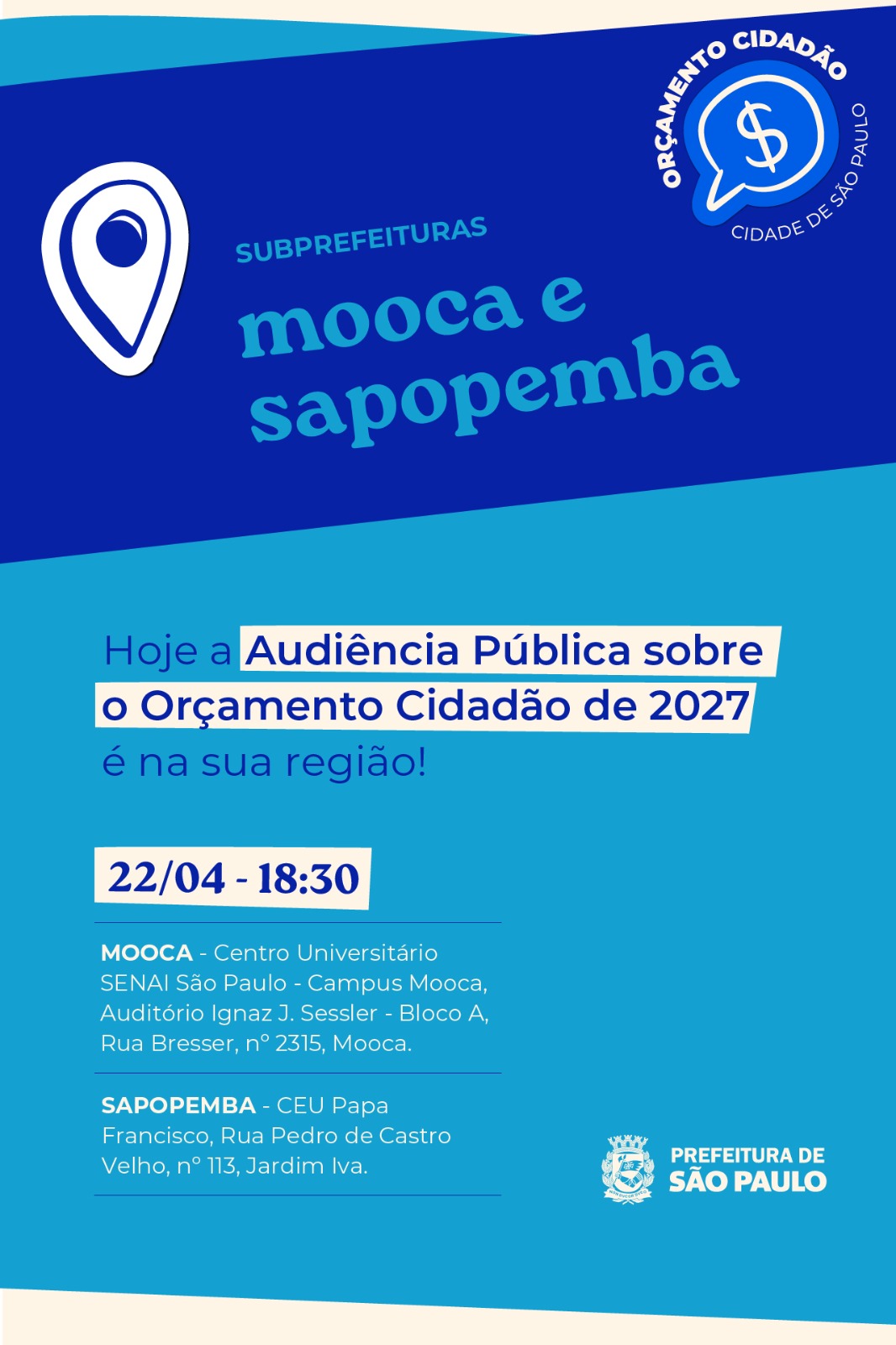 A Prefeitura de São Paulo abre entre 1 de abril e 15 de maio a plataforma para as contribuições online ao Orçamento Cidadão 2027 e realiza as audiências públicas presenciais em cada uma das 32 subprefeituras de 6 de abril a 5 de maio, de segunda a quinta-feira, sempre às 18h30. Para o próximo ano, as propostas apontadas pelo cidadão no seu território serão priorizadas dentro dos Conselhos Participativos Municipais (CPMs), também eleitos pela população, que já indicarão aquelas submetidas à viabilidade técnica e orçamentária. Hoje, são R$ 10 milhões garantidos para cada uma das 32 subprefeituras da capital.
