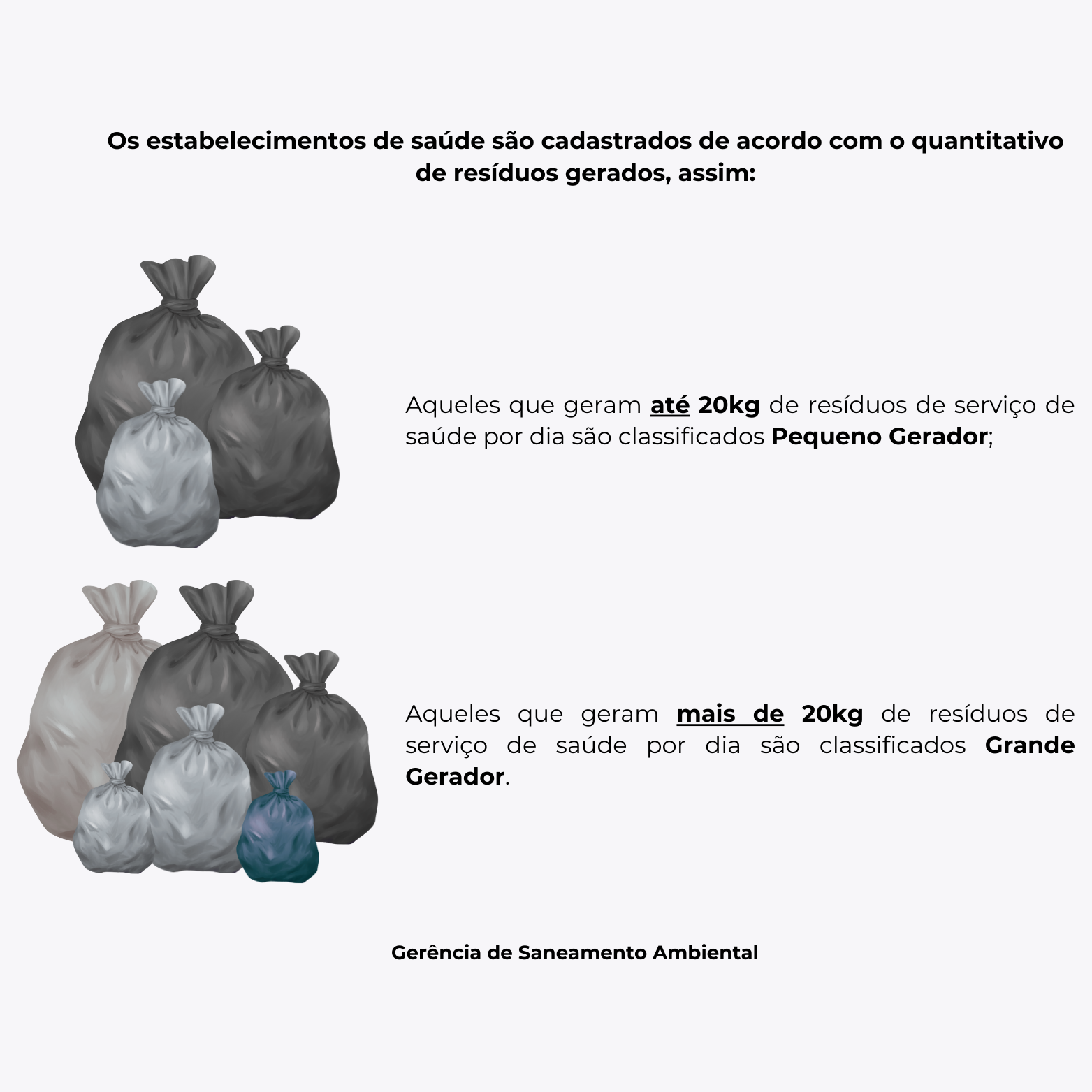 O estabelecimento com potencial geração de resíduos de serviços de saúde são enquadrados em uma faixa de geração autodeclarado pelo representante legal e ao estabelecimento é atribuída uma TRSS – Taxa de Resíduo de Serviço de Saúde.