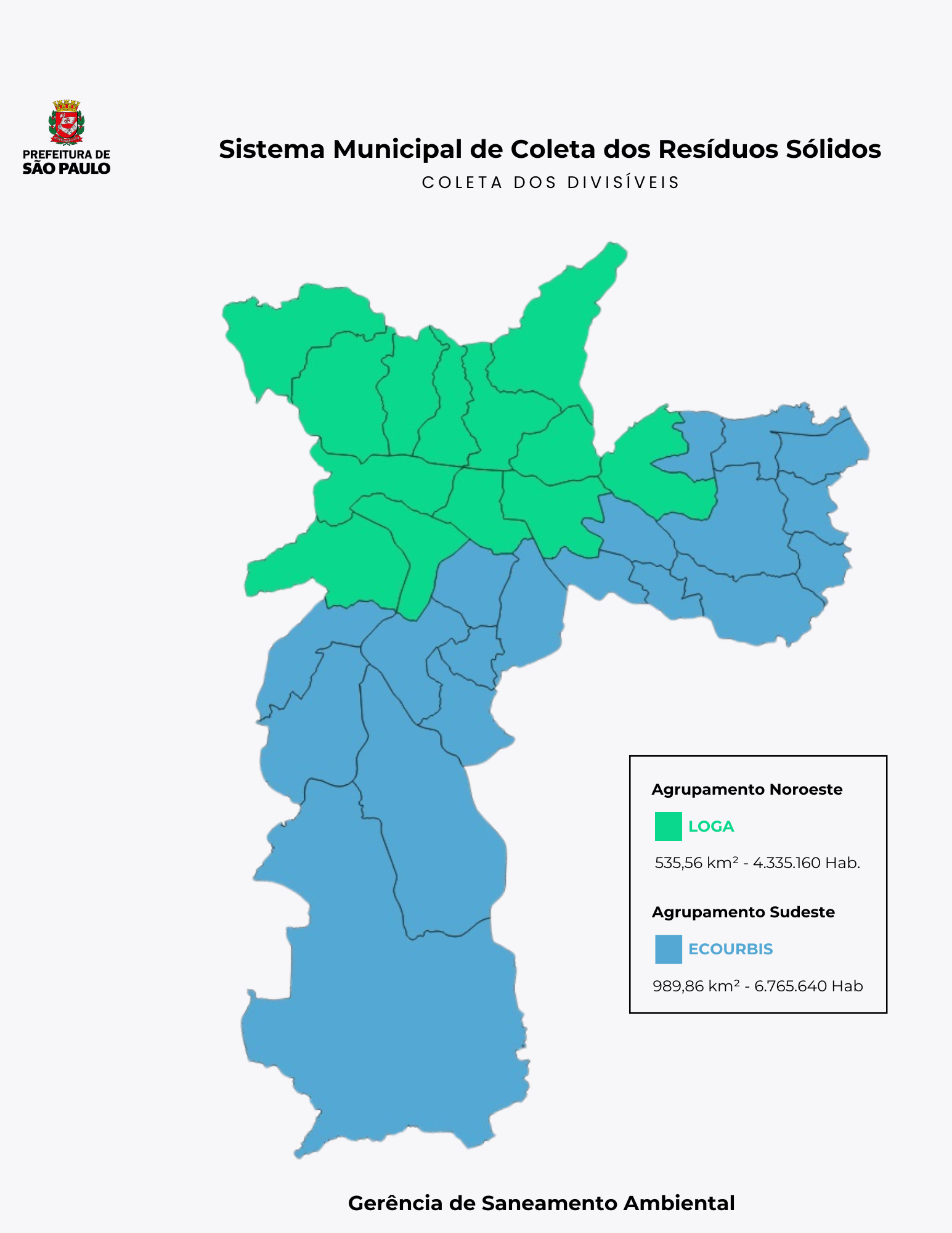 Em conformidade com a lei foi contratada por intermédio da Secretaria de Serviços, em conjunto com a Autoridade Municipal de Limpeza Urbana (Amlurb), as concessionárias Loga - Logística Ambiental de São Paulo S.A., responsável pela prestação dos serviços divisíveis no agrupamento Noroeste (Centro, Norte e Oeste) e a concessionária Ecourbis Ambiental S.A., responsável pelo agrupamento Sudeste (Sul e Leste).