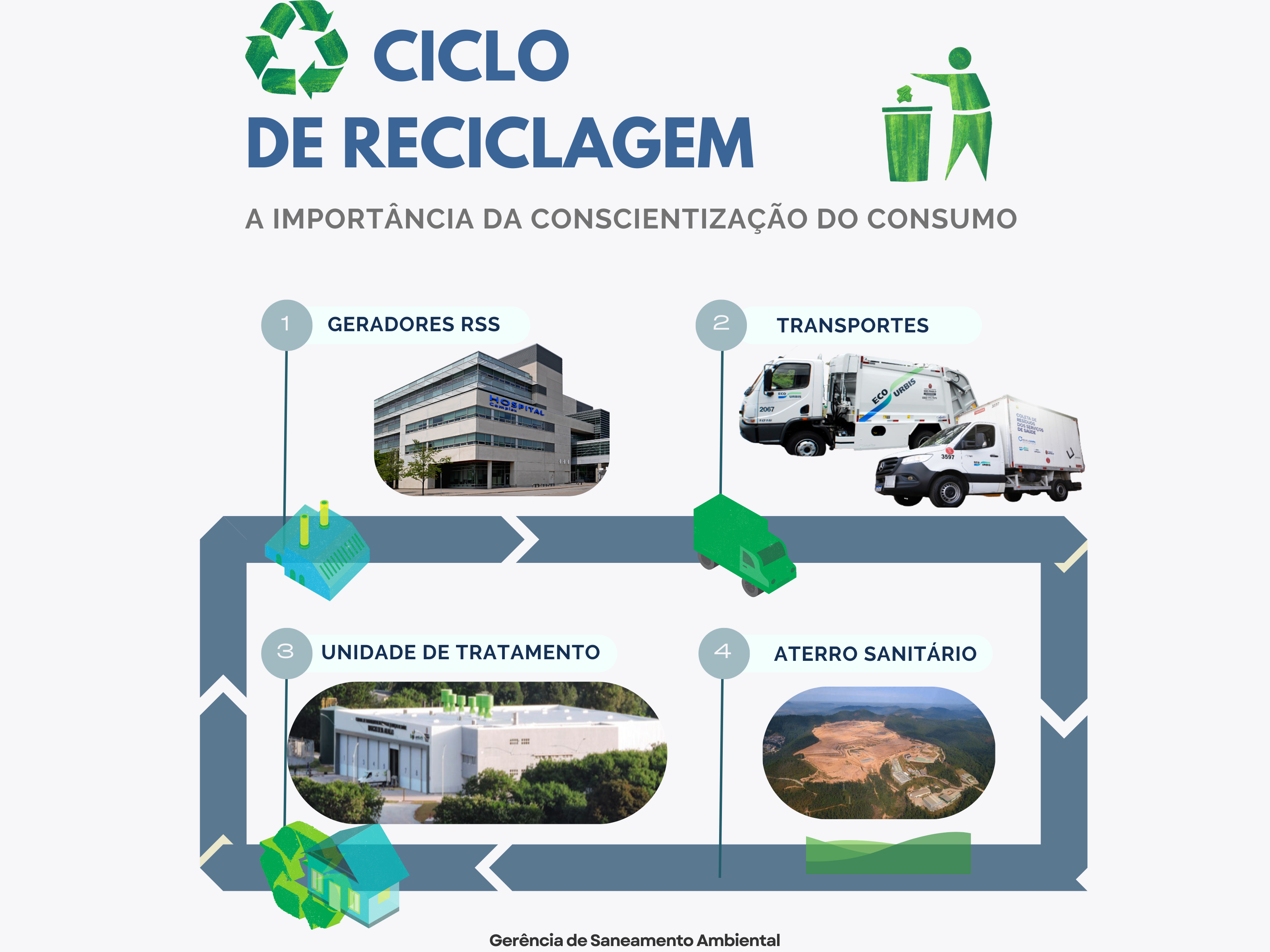 Após a coleta, os resíduos são encaminhados para unidades de tratamento devidamente licenciadas pelo órgão ambiental e posteriormente seguem para aterros sanitários também devidamente licenciados. Confira na imagem abaixo como acontece o ciclo.